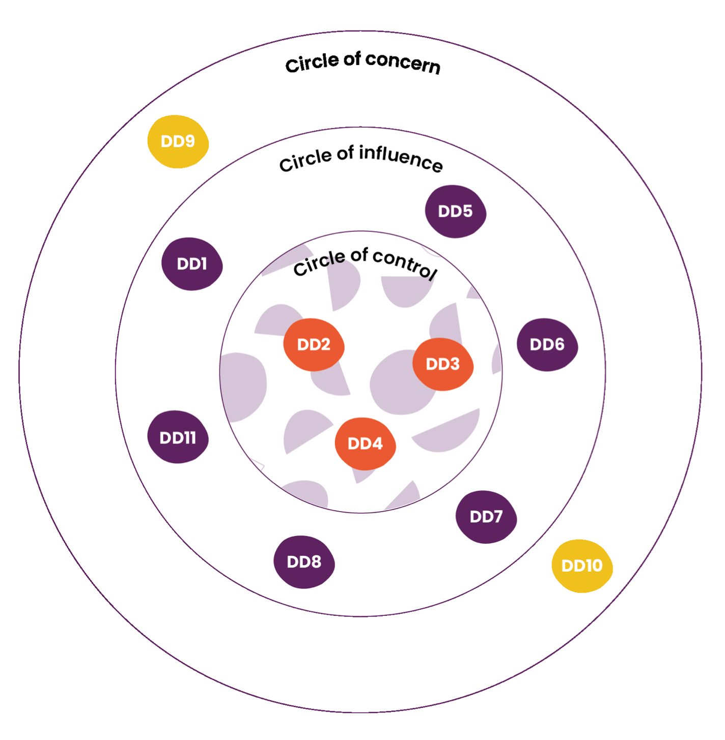 De dilemma’s omtrent duurzaam verpakken kunnen worden ingedeeld in verschillende cirkels. Binnen de circle of concern vallen alle zaken waarbij iemand betrokken is en zorgen over heeft, maar geen invloed op heeft. Daarbinnen bestaat de kleinere circle of influence, die betrekking heeft op zaken waarop iemand daadwerkelijk invloed kan uitoefenen. Dáárbinnen valt weer de kleinste circle of control: de zaken waar iemand controle over heeft. Door de duurzaamheidsdilemma’s in te delen in deze cirkels, weten we bij welk knelpunt bedrijven controle ervaren of waar samenwerking nodig is om meer invloed te krijgen. Deze dilemma’s zitten vooral in de circle of influence.
