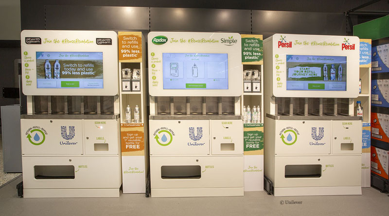 Unilever test hervulbare verpakkingen uit voor zeven van zijn bekendste merken in de Asda-winkel in Middleton in het Verenigd Koninkrijk. ‘Het is onze grootste proef met het hervullen en hergebruik van verpakkingen in Europa.’