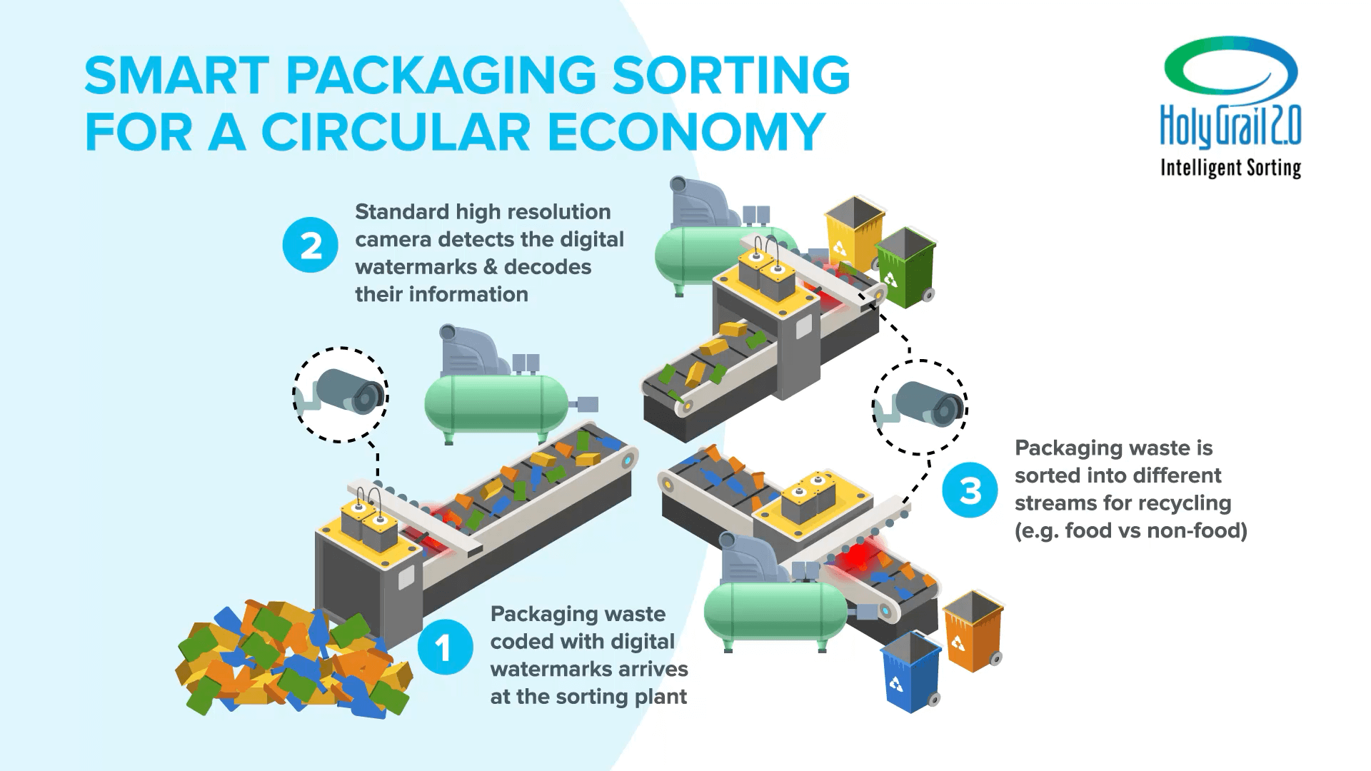 Wanneer verpakkingen een afval- en sorteerfaciliteit binnengaan, kunnen de digitale watermerken worden gedetecteerd en gedecodeerd door een hoge resolutie camera op de sorteerlijn. Vervolgens kunnen - op basis van de informatie in de codes - de verpakkingen in de juiste afvalstromen worden gesorteerd. Dit zou resulteren in betere en nauwkeurigere sorteerstromen en dus een hogere kwaliteit van recycling.