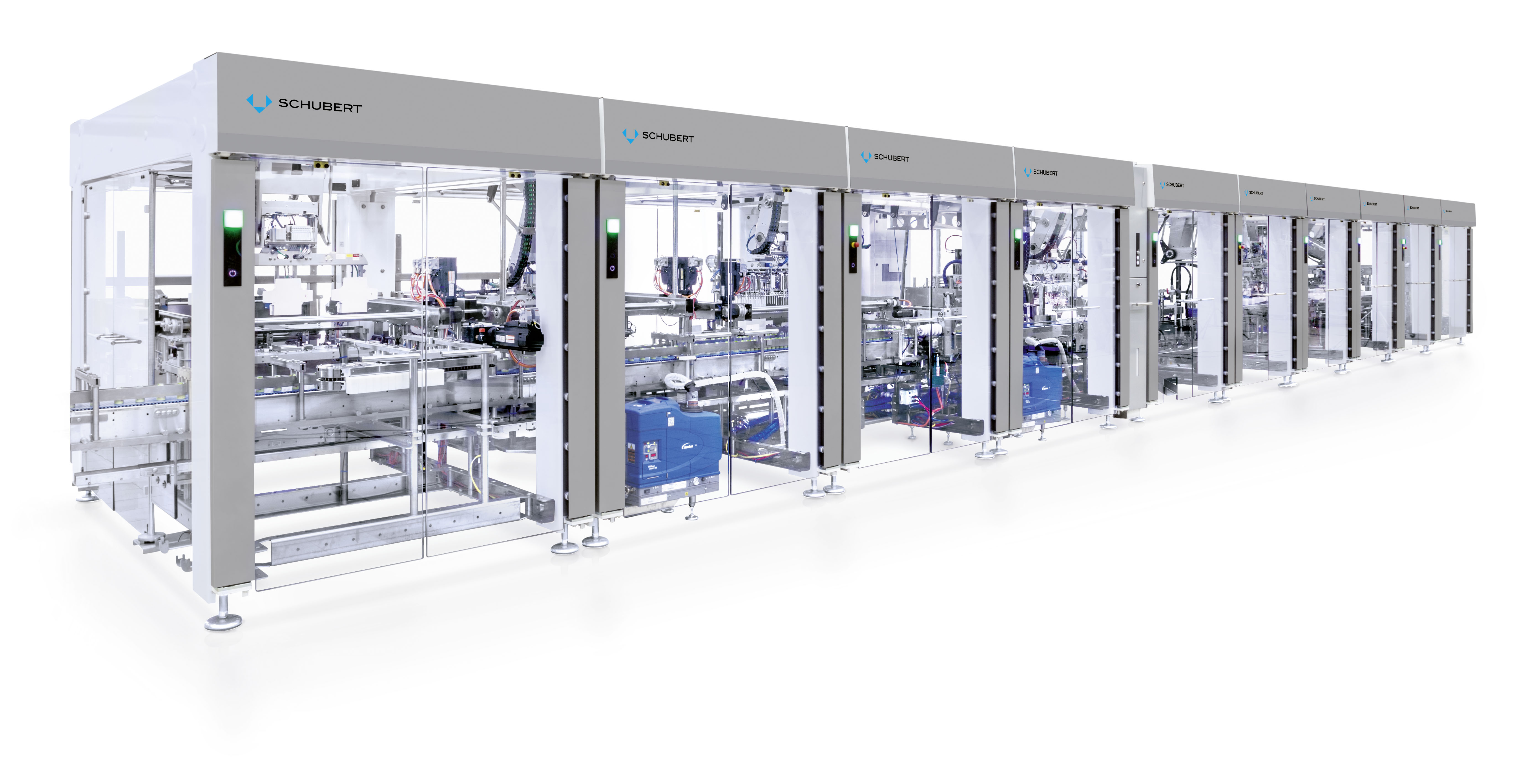 De probiotische Yakult drank wordt voor de Europese markt geproduceerd in Almere. De fabriek heeft haar productiecapaciteit recent verhoogd en kan met de nieuwe Schubert-machine 43.200 flessen per uur verpakken. De fabriek levert aan 13 Europese landen, vertelt Ronald Jacobs, plantmanager bij Yakult Europe. ‘We wilden bij de secundaire verpakking van kunststof folie naar karton overstappen. Samen met de experts van Schubert ontwikkelden we een milieuvriendelijke en praktische verpakkingsvorm.’ De machine moest geschikt zijn voor flexibele formaatopties, hoge prestaties en moest weinig plek innemen. Schubert koos voor een combinatie van verschillende F2-robots, vier Transmodul-secties en beeldherkenningssystemen. Het snelle formaatomstelsysteem ondersteunt secundaire verpakkingen met 6 of 8 flesjes.