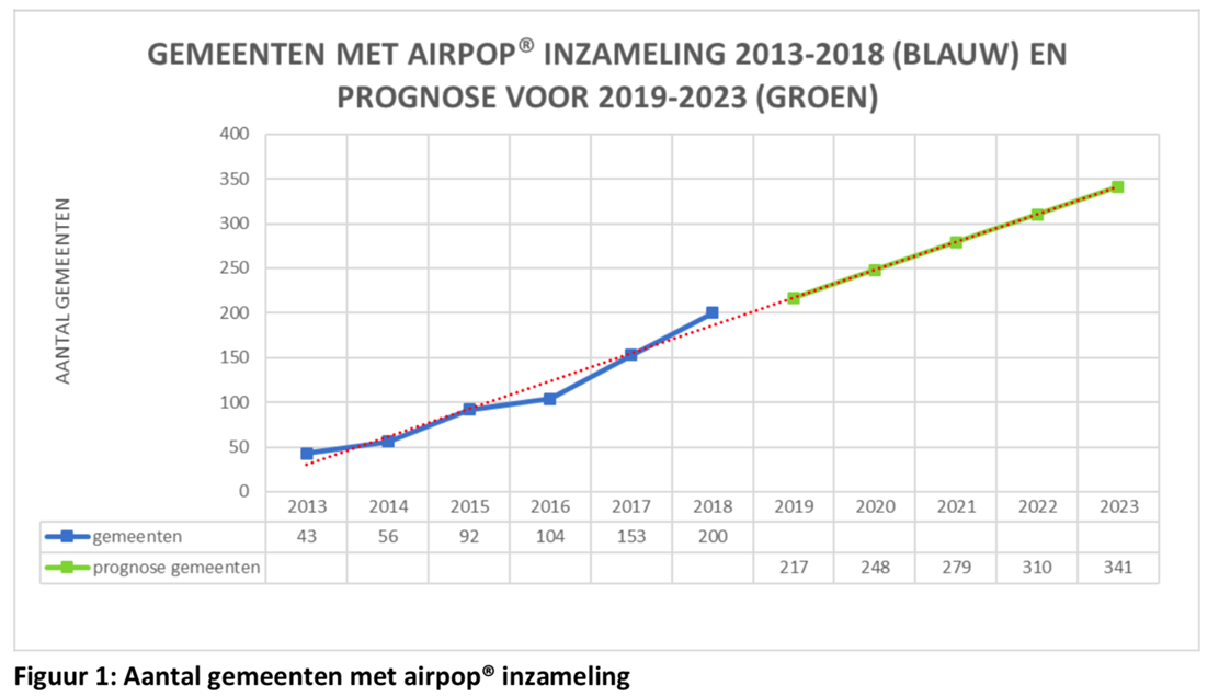 Van 2019 tot 2023 wordt een verdere stijging van de inzameling en inzamelpunten voor airpop (EPS) verwacht. Voor deze periode is een groei van het aantal milieustraten geprognotiseerd van 217 in 2019 naar 341 in 2023 (zie onderstaand Figuur 1).