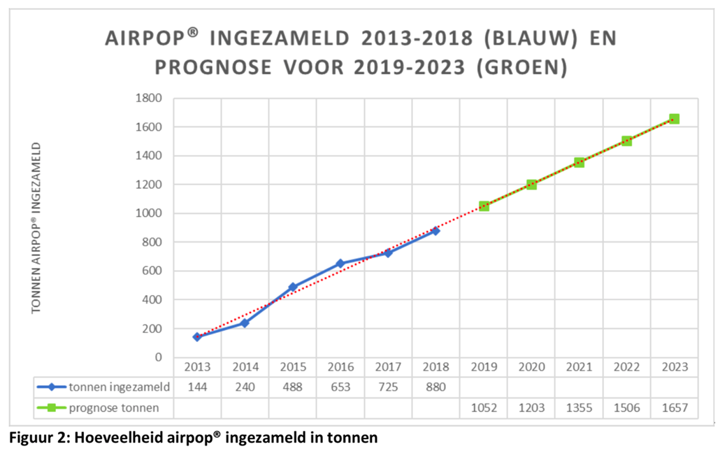 Nederland is volgens de brancheorganisatie koploper in Europa met de inzameling en recycling van airpop (EPS). Op basis van de ingezamelde hoeveelheid in 2018, wordt in 2019 een groei verwacht naar 1052 ton en in 2023 een groei naar 1657 ton (zie onderstaand Figuur 2).