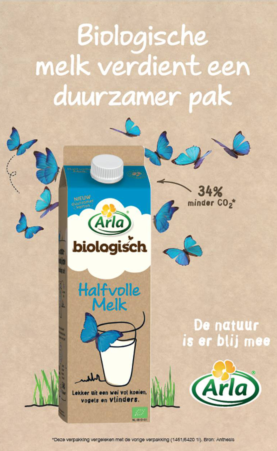Zuivelproducent Arla heeft samen met verpakkingsleverancier Elopak de CO2-uitstoot van haar zuivelpakken forst verlaagd. Voor het nieuwe zuivelpak wordt 100% ongebleekt bruin karton gebruikt. Ook de gladde afwerking die bij de reguliere verpakking aan de buitenkant zat, ontbreekt. Deze innovatie in combinatie met de toepassing van hernieuwbare kunststof voor dop en coating zorgt ervoor dat de CO2-uitstoot per verpakking met 34% is gereduceerd.