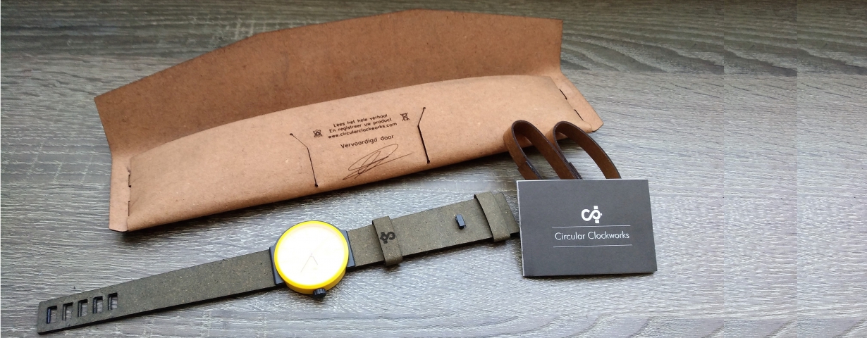 Circulair Clockworks introduceert een horloge waarvan de kast is gemaakt van gerecycled PS- en ABS-granulaat en het leren bandje en de verpakking zijn gemaakt uit afval afkomstig van de schoenindustrie.