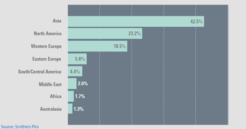 In regionale termen domineert Azië momenteel de wereldwijde verpakkingsmarkt, verantwoordelijk voor 42,5% van de verkoopwaarde in 2018. De regio is ook de meest dynamische van de laatste tijd, vanwege een snelle groei in de vraag naar verpakte producten onder de gestaag groeiende stedelijke bevolking van landen zoals China en India.