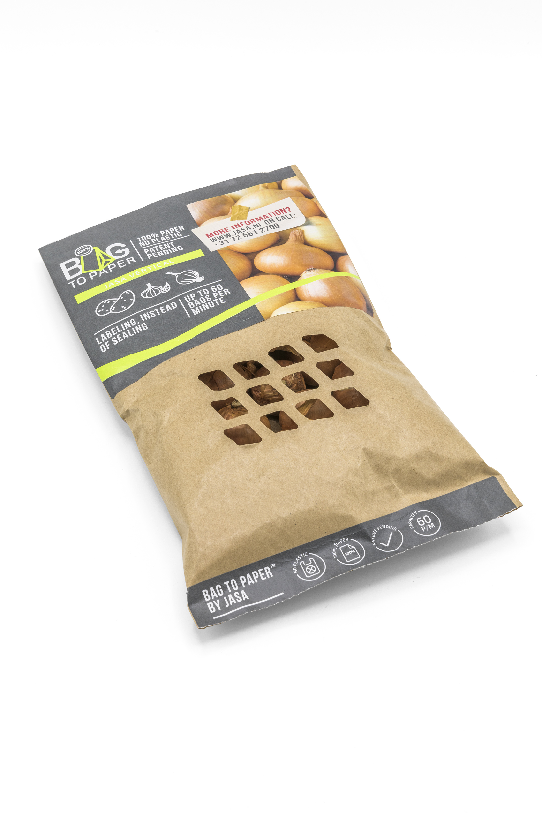 Machineproducent JASA introduceert een verticale vorm-, vul- en sluitmachine die papieren zakjes produceert en sluit zonder te sealen. Dit zogenoemde Bag-2-Paper concept is 100% van papier, zonder plastic coating en daardoor volledig recyclebaar.