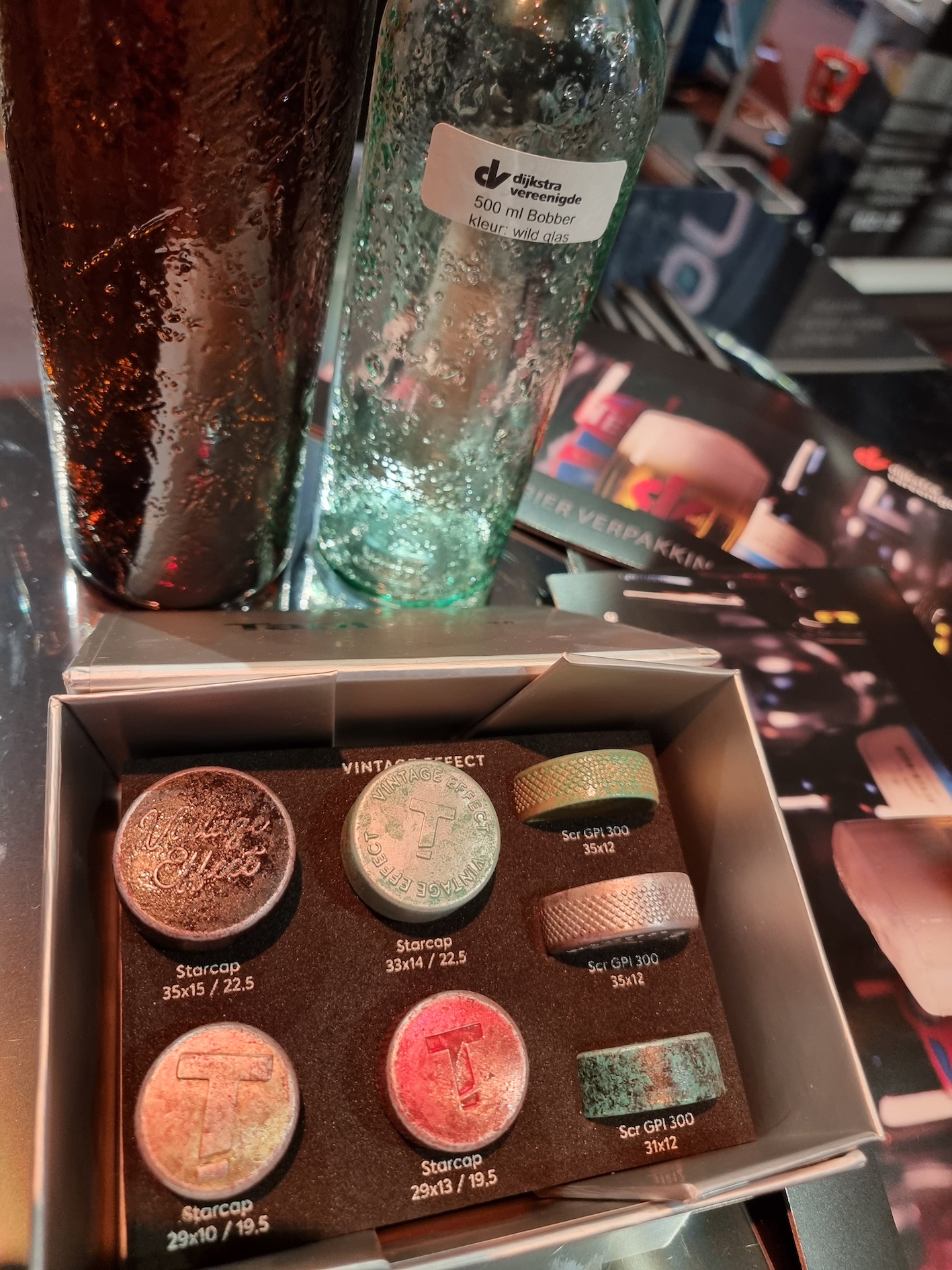 Dijkstra Vereenigde, een bekende leverancier van flessen, vestigde de aandacht onder meer op wild glas, 100% gerecycled glas uit Italië. Ook waren er vintage doppen te zien, die zijn gemaakt uit hergebruikt materiaal. ‘Een manier om op te vallen in de winkel’, verklaarde Rob Verbakel. ‘We leveren een breed scala aan flessen, maar tegenwoordig ook blikken. We zien de vraag toenemen en leveren daarom blanco blikken.’